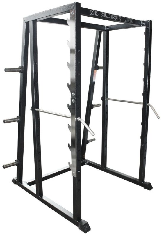 Безопасность при выполнении упражнений обеспечивают параллельные горизонтальные перемычки, не допускающие падения штанги. Приставив регулируемую скамью внутрь рамы, можно выполнять различные жимы со штангой.