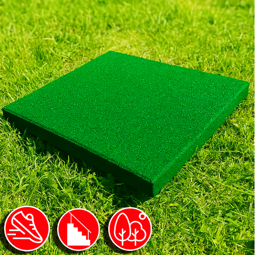 Плитка идеально подходит для обустройства уличных площадок, требующих повышенной безопасности при ударных нагрузках. Её можно использовать круглогодично. Материал изготовления — прессованная резина, обработанная под воздействием высокой температуры.