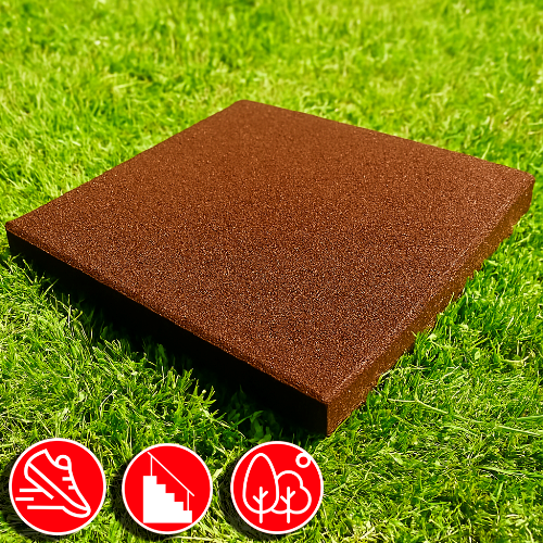 Плитка идеально подходит для обустройства уличных площадок, требующих повышенной безопасности при ударных нагрузках. Её можно использовать круглогодично. Материал изготовления — прессованная резина, обработанная под воздействием высокой температуры.