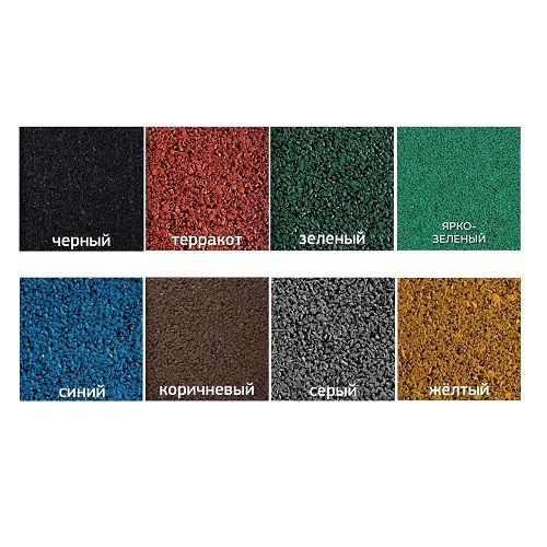 Плитка для спортивных площадок доступна в стандартных цветах - черный, зеленый, терракотовый. Также возможно изготовление плитки в нестандартных цветах, таких как ярко-зеленый, желтый, синий, коричневый и серый.